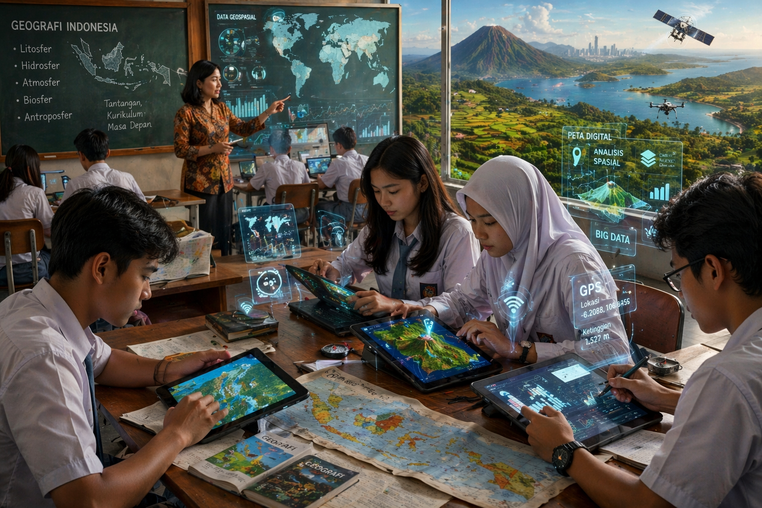 Kemajuan teknologi digital juga membuka peluang yang luas bagi pembelajaran geografi. Teknologi geospasial seperti Sistem Informasi Geografis (SIG), penginderaan jauh, serta berbagai aplikasi pemetaan digital memungkinkan fenomena geografis dipelajari secara lebih visual, interaktif, dan kontekstual. Berbagai fenomena seperti perubahan penggunaan lahan, persebaran bencana, hingga perkembangan wilayah perkotaan dapat dianalisis secara lebih nyata melalui data spasial.