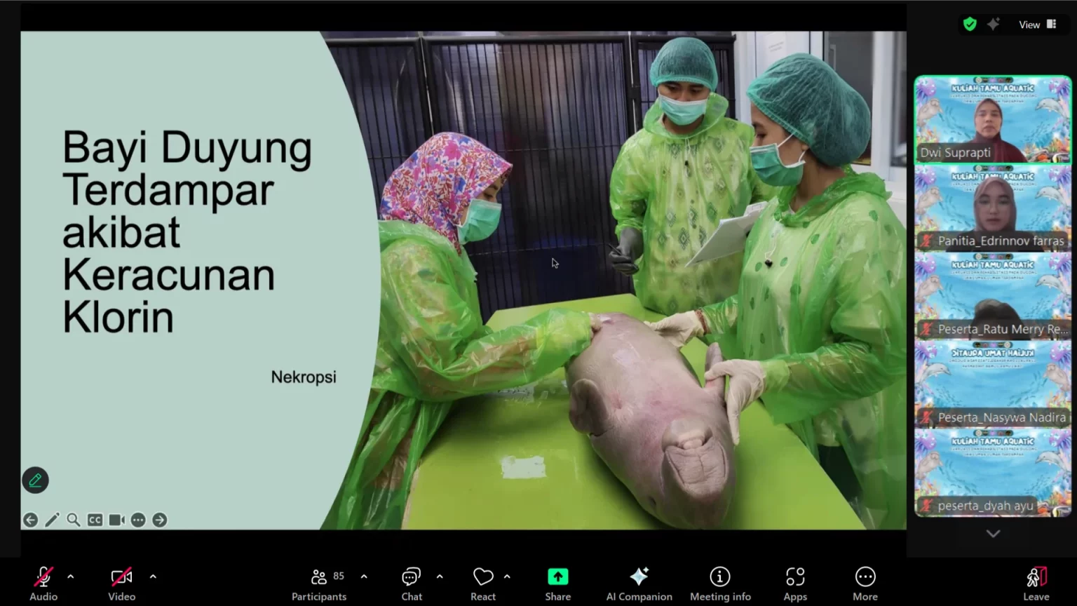 Dalam pemaparannya, Drh Dwi menyebut bahwa mamalia laut seperti dugong dan lumba-lumba memiliki struktur tubuh serta sistem pernapasan yang sangat berbeda dari ikan.